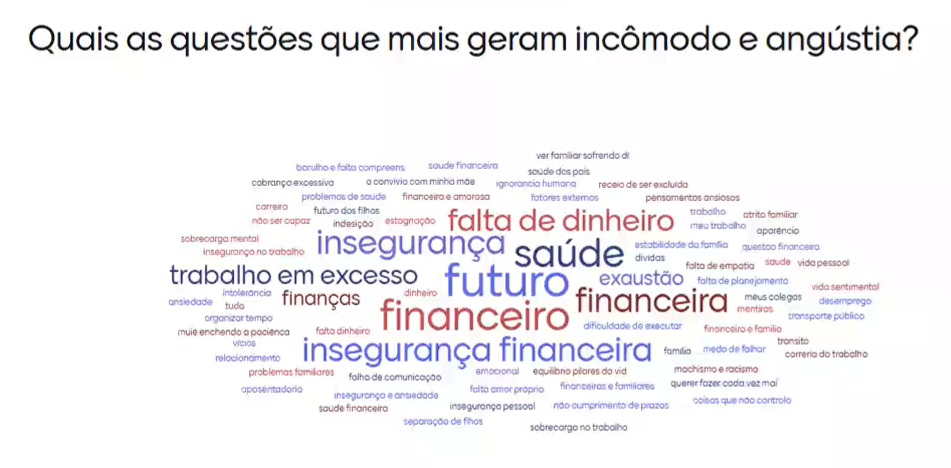 Durante a palestra, os participantes interagiram em uma dinâmica pelo Mentimeter, respondendo de forma anônima à pergunta: “Quais questões mais geram incômodo e angústia no seu dia a dia?”